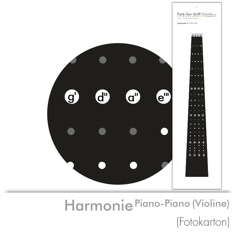 folgt mit kleineren Punkten (als beim Modell Piano-Piano Plus) dem Prinzip der Klaviertastatur, d.h. ein weißer Punkt auf der Grifftabelle entspricht einer weißen Klaviertaste, ein dunkler Punkt einer schwarzen Klaviertaste. Die größeren weißen Punkte zeigen die Flageolette-Töne bei Quinte und Oktave ohne Tonbezeichnungen.